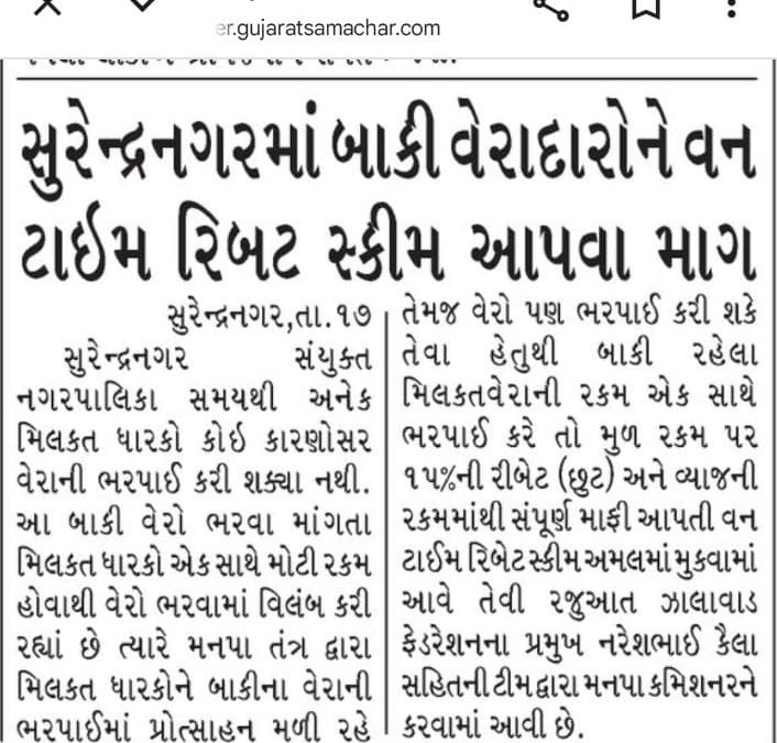 સુરેન્દ્રનગરમાં બાકી વેરાદારોને વન ટાઈમ રિબટ સ્કીમ આપવા માગ. by nareshkella | May 21, 2025 | Media presence | 0 comments Submit a Comment Cancel replyYou must be logged in to post a comment.
